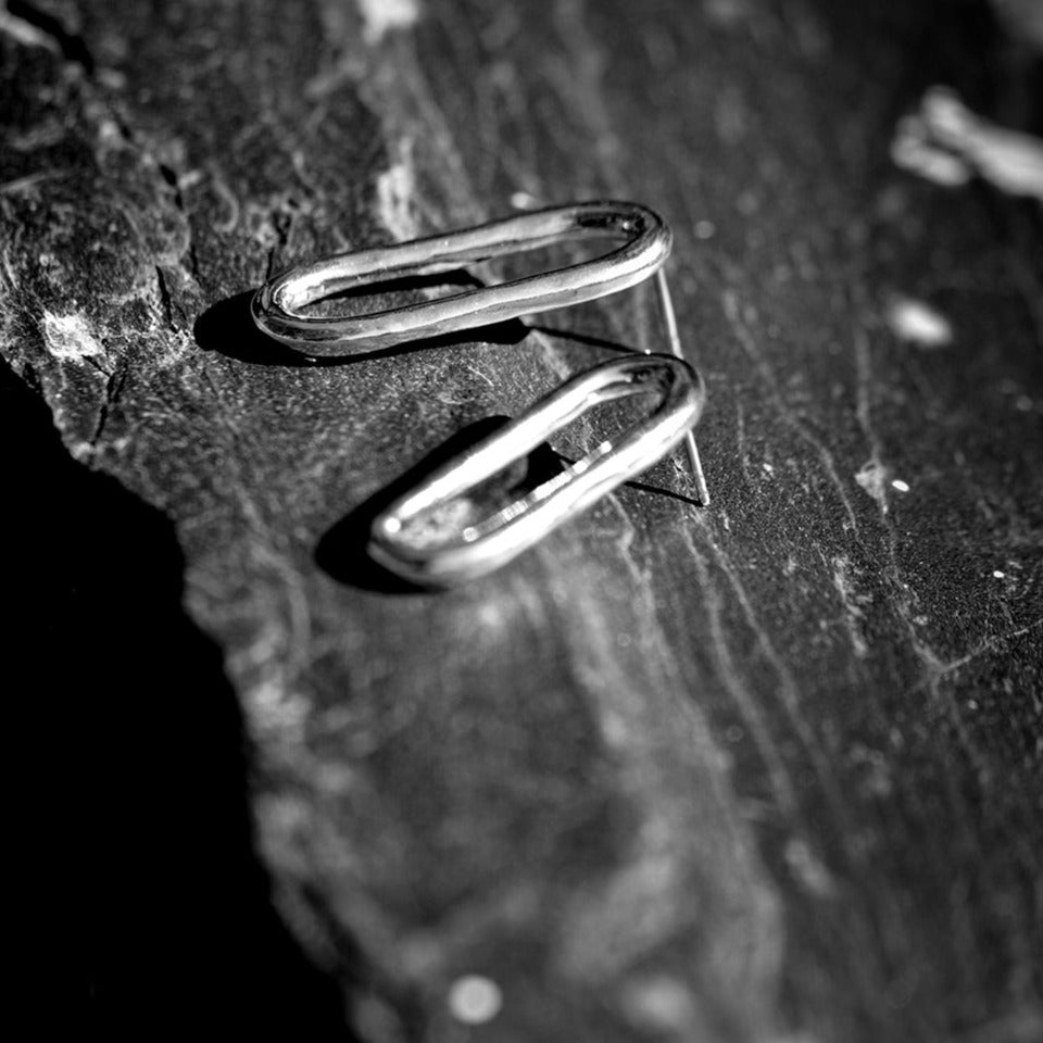 Lähtö Earring in Sterling Silver. Handformed elongated oval design.