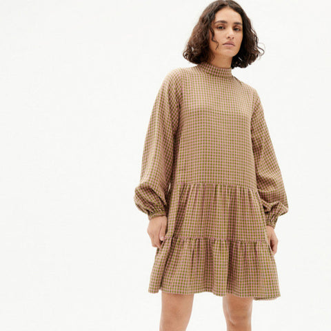 Long-sleeved dress. Closure with belt and natural Corozo buttons on the cuffs.